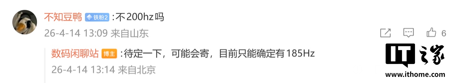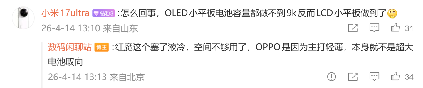 后续有用户在评论区询问:“怎么回事,OLED 小平板电池容量都做不到 9k 反而 LCD 小平板做到了”,博主回复道:“红魔这个塞了液冷,空间不够用了,OPPO 是因为主打轻薄,本身就不是超大电池取向”;另一名用户则询问:“不 200hz 吗”,博主则回复道:“待定一下,可能会寄,目前只能确定有 185Hz”。