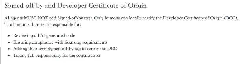 只有人类才能合法签署 Linux 内核的开发者来源证明(Developer Certificate of Origin,DCO)。这是确保代码许可合规的法律机制。换句话说,即便你提交的补丁完全由 AI 编写,责任仍然只在你本人,而不是 AI 或其提供方。