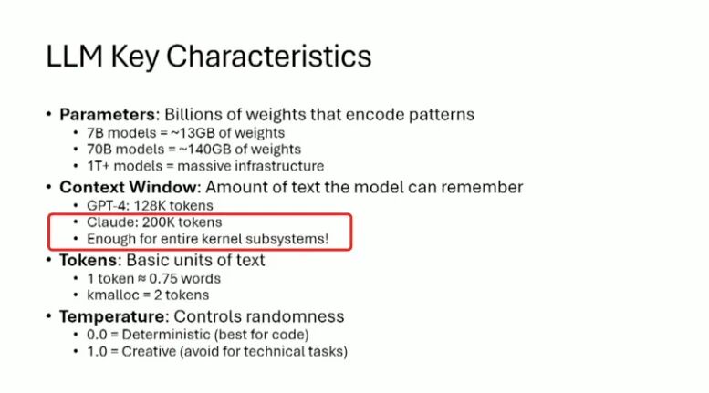 同时,LLM 依赖“上下文窗口”工作,也就是它在回答时能够“记住”的输入文本。像 Claude 这样的系统,上下文窗口大约在 20 万 token 左右,已经足够覆盖一个完整的内核子系统。