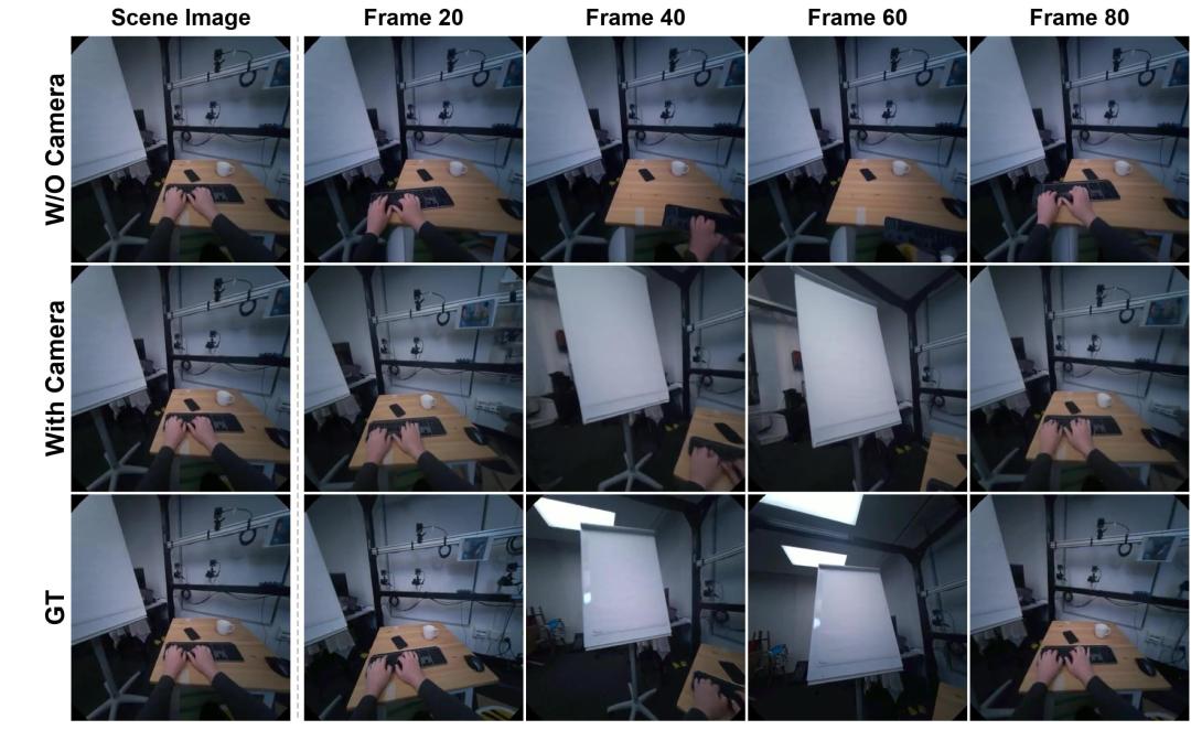 移除相机建模模块后,FVD从218直接飙到815——背景开始跟着手一起漂移。