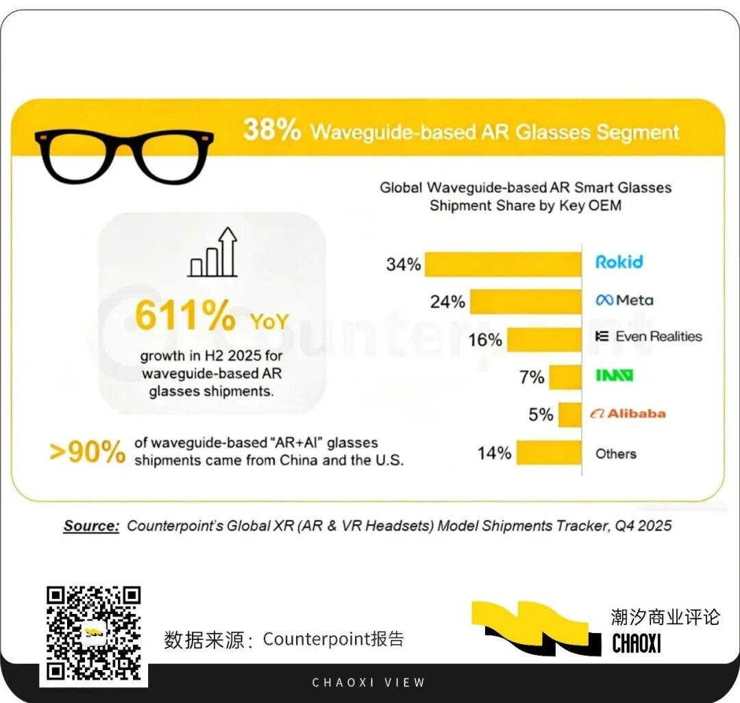 这种“破圈”并非偶然 , Rokid与BOLON的合作款打的是“时尚设计”与“硬核功能”两张牌——让眼镜先像一副眼镜。 这个思路,恰恰击中了行业最核心的痛点:产品不好看 , 用户不愿意戴,再强的功能也是零。去年, Rokid 乐奇AI眼镜年订单量超35万台。 根据Counterpoint报告显示,2025年下半年,全球超过90%的“AR+AI”眼镜出货量来自于中国和美国。其中,Rokid的出货量占据了34%的全球市场份额,位居第一,领先于Meta、Even Realities等竞争对手。
