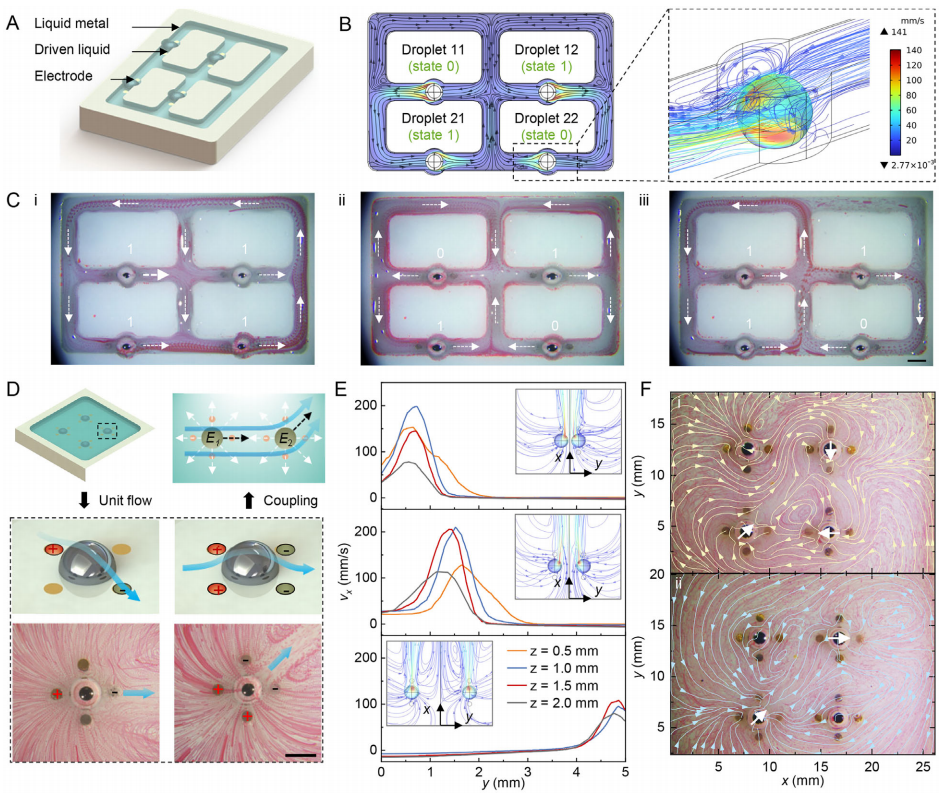 基于上述机理,研究团队进一步构建了几种可编程的毫-微流控平台:基于脉冲方波激励,在通道网络和开放空间中,他们通过集成液态金属液滴并控制电极阵列的工作模式,实现了多路径、多方向的流体逻辑切换与流场拓扑重构;基于无偏方波激励,实现了开放/封闭流体环路的流向与流速调控。这些器件展示了液态金属连续电润湿技术在复杂流场编程中的潜力,且无需依赖任何机械移动部件。与传统驱动方式相比,该研究提出的方法具有低压驱动、流速可调范围广、多模式实时切换、兼容开放与封闭系统以及长期稳定性好等显著优势,为下一代智能、可重构的片上流体系统奠定了坚实基础。