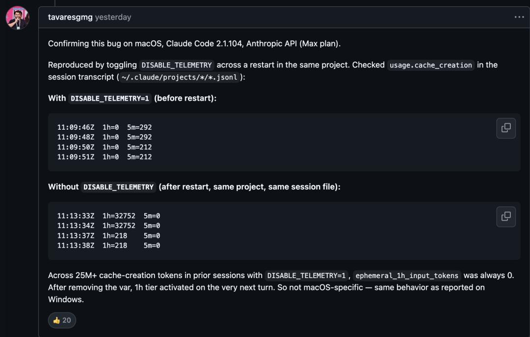 开发者们发现,只要在环境变量里加一句DISABLE_TELEMETRY=1,Claude Code的prompt cache TTL就从1小时瞬间回退到5分钟。