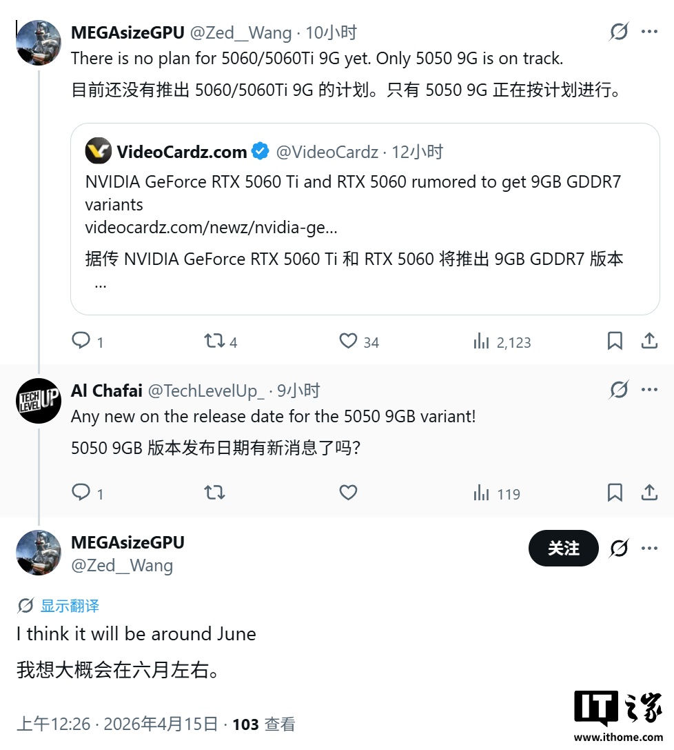 IT之家发文前查询相关资料,消息源 @Zed__Wang 并不认可该爆料信息,指出英伟达目前没有计划推出 9GB 版 RTX 5060 和 RTX 5060 Ti,目前计划 6 月推出 9GB 版本的 RTX 5050 显卡。