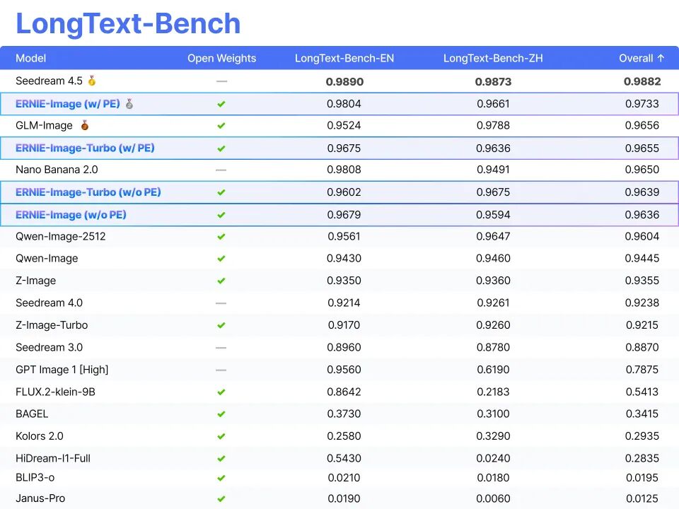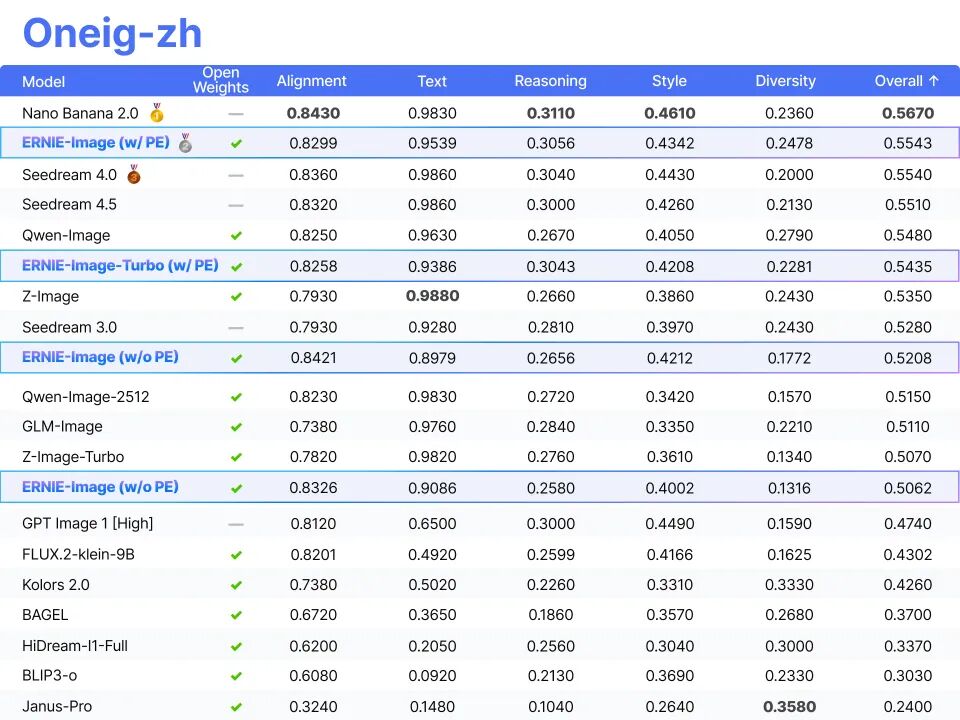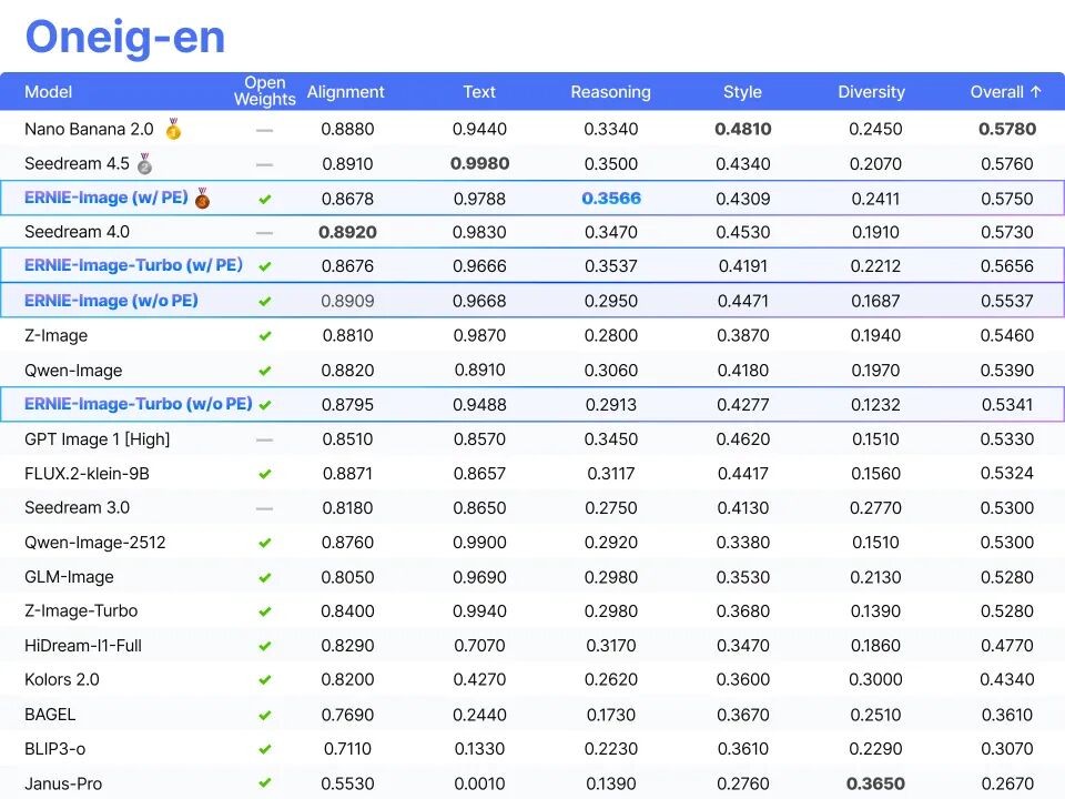 评估结果表明,在所有开源模型中,ERNIE-Image 的综合表现处于领先位置,展现出其在通用图像生成、双语理解、复杂指令执行等各类任务中的强大能力。尤为突出的是,在文字渲染能力上,ERNIE-Image 取得了开源模型的 SOTA 效果,与 NanoBanana 等商业闭源模型同处第一梯队。