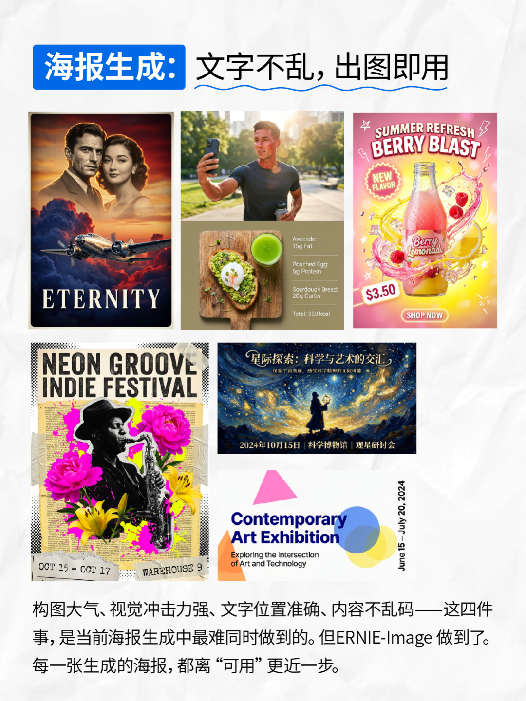 经过电影网、凤凰网、蜻蜓 FM、瑛麒动漫、蜂鸟 AI 等 30 多个知名企业、社区和创作平台,20 位艺术创作设计师为期两周的内测与反馈,今天,我们正式开源 ERNIE-Image 模型,参数量仅 8B,24GB 显存的消费级显卡即可生成媲美顶级商业模型的超真实、复杂图像。