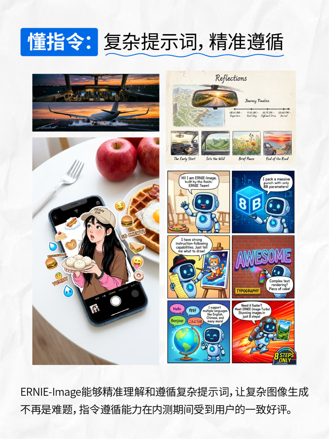 在指令遵循、文字渲染能力上,ERNIE-Image 从容驾驭复杂细节约束、多主体关系和知识密集型描述;更在中英日韩多语言生成中实现了字形清晰与笔画精准,无论是海报排版、学术图表的严谨逻辑,还是漫画分镜的叙事张力,皆能保持完美的布局组织与画面秩序,这两项能力在开源模型中均排名第一。