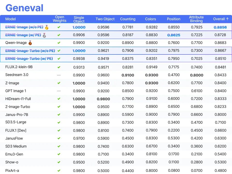 我们在多个公开的国际基准上对 ERNIE-Image 进行了全面评估,包括用于通用图像生成的 GenEval、OneIG(中英文),以及用于复杂指令与文字渲染的 LongText-Bench。