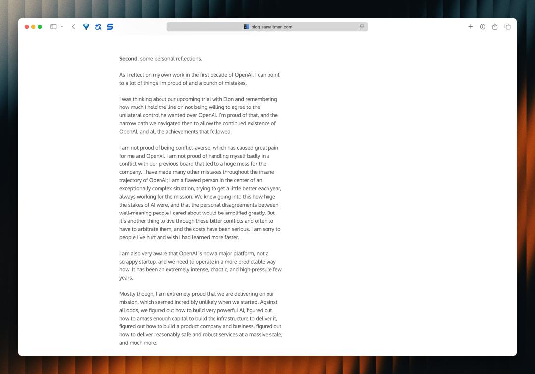 萨姆·奥尔特曼不是人们熟悉中的那类技术天才,他可能也没有奥本海默那么伟大,他大概只具备了奥本海默最微不足道的一种能力——说服他人。但他可能也没有那么不堪和伪善,如果你有心翻阅过他早年间的博客文章,或许也能认同他对技术未来真诚的担忧。