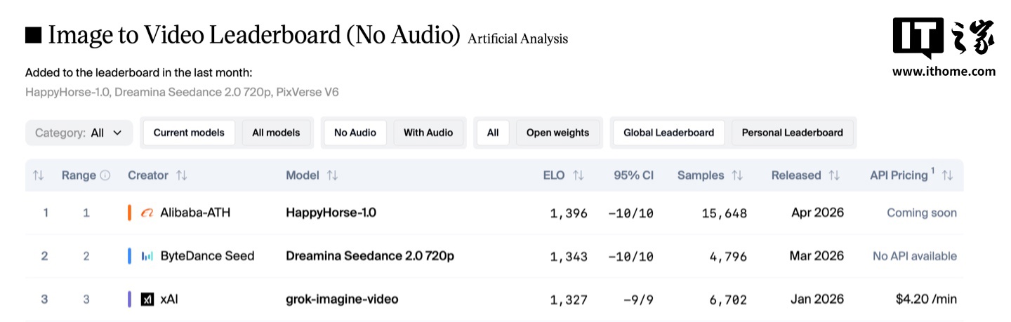 IT之家查询获悉,HappyHorse-1.0 目前登顶 Artificial Analysis 的 AI Video Arena 排行榜,超过了字节跳动的 Seedance 和快手可灵等模型。