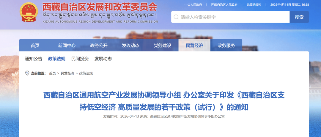 C114讯 4月15日消息(兰茜)近日,为发展新质生产力,打造低空经济产业,西藏自治区通用航空产业发展协调领导小组办公室印发《西藏自治区支持低空经济高质量发展的若干政策(试行)》(以下简称《政策》)。