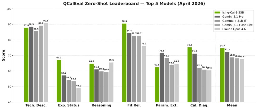 结果显示,350亿参数的Ising-Calibration-1在解释实验结果、分类结果、评估结果重要性、评估拟合质量和关键特征,以及生成可行性建议这六个评估维度上,平均得分达到SOTA,超过了Gemini 3.1 Pro、GPT 5.4、Claude Opus 4.6等顶级闭源模型。