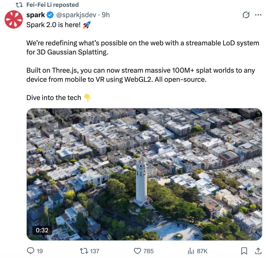 就在今天凌晨,李飞飞空间智能独角兽公司 World Labs 官宣推出「Spark 2.0」,将最具野心的 3DGS(3D 高斯泼溅)世界带入到 Web。