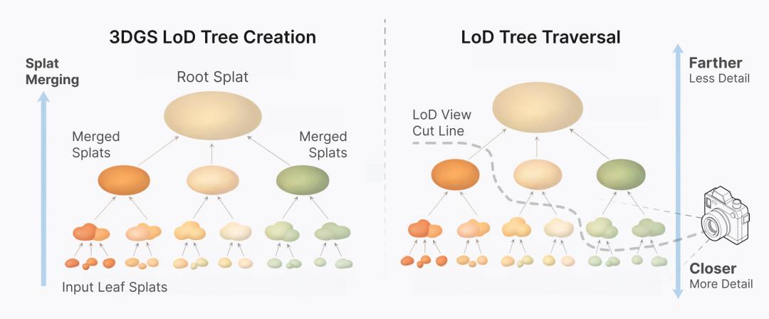 在这棵树里,每一个内部节点,都是由其子节点合并得到的低分辨率版本:通过把多个子 splat 合成为一个新的 splat,用来近似它们整体的形状和颜色。这个过程不断向上递归,直到树的根节点,也就是:一个单一的大 splat 汇总了整个对象中所有 splat 的整体形状与颜色。