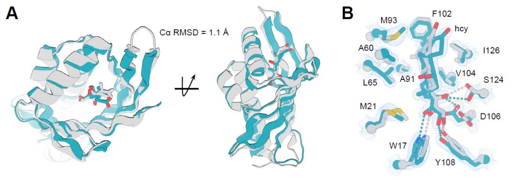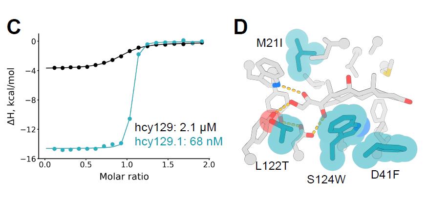 随后,研究人员从该文库中筛选出最佳变体,在大肠杆菌中表达并通过等温滴定量热(ITC)进行表征。该变体 hcy129.1 的 KD 为 68 nM,相较原始设计提高了 31 倍(如下图 C);结构分析表明,亲和力增强主要源于与皮质醇之间更强的疏水相互作用(下图 D)。