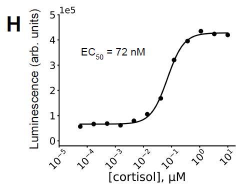 实验表明,该体系仅在皮质醇存在时形成稳定复合物。进一步地,研究将该体系与 NanoBiT 荧光素酶系统融合,实现皮质醇传感功能,检测到 EC50 约为 72 nM(下图 H),与结合亲和力一致,验证了设计的有效性。同时,体系在无皮质醇条件下亲和力显著降低,表明二聚作用具有良好的配体依赖性。