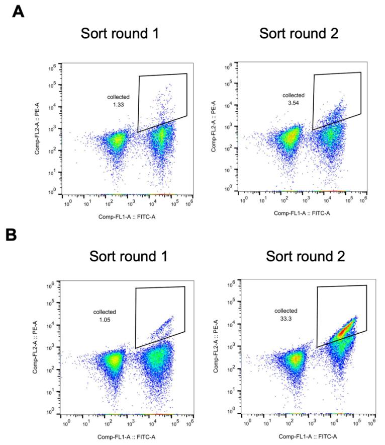 皮质醇在生理样本中通常以低纳摩尔浓度存在,而当血浆皮质醇水平高于 38 nM 时,可作为库欣综合征等疾病的诊断依据。为提高 hcy129 对皮质醇的结合亲和力以用于生物传感,研究人员基于其单点饱和突变(SSM)实验中筛选出的有利突变构建了组合突变体文库,并通过酵母展示进行筛选,观察到结合亲和力显著提升,如下图所示: