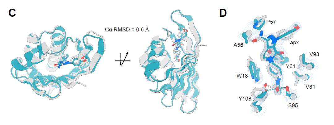 另一方面,apx1049 与阿哌沙班复合物的晶体结构分辨率为 2.1 Å,与设计模型一致性更高,在 113 个残基范围内的 Cα RMSD 仅为 0.6 Å(下图 C)。其蛋白–配体相互作用几乎完全复现设计,包括关键氢键及芳香残基间的 π–π堆积作用(下图 D),从而稳定配体构象并形成高度形状互补的结合口袋。这些结果证明了该设计策略在原子尺度上实现了高精度的蛋白–配体界面构建。