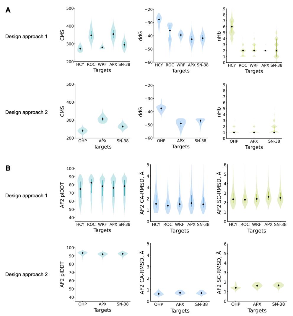 在筛选设计结果时,研究人员使用 Rosetta 计算蛋白–配体之间的氢键数量、结合能(ddG)以及接触分子表面积(CMS);对于方法 2,还结合单序列 AlphaFold 预测结果,筛选能够同时再现目标折叠结构及结合位点的设计(见下图)。
