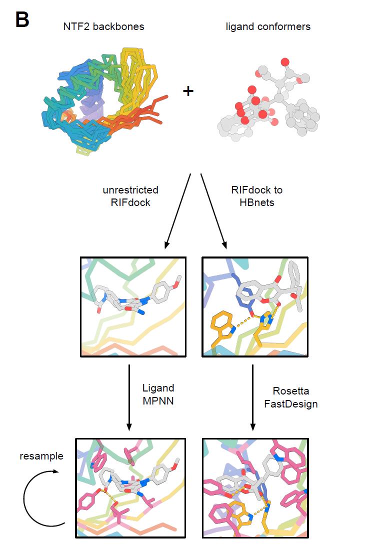基于 NTF2 折叠的小分子结合蛋白设计流程示意图