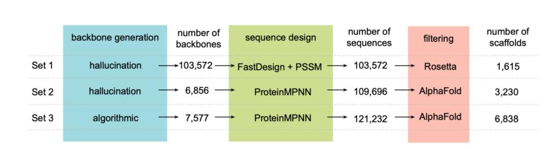 为实现设计目标,研究人员首先通过家族级「幻觉(hallucination)」方法生成了一组 NTF2 结构(集合 1:1,615 个 backbones),随后利用 ProteinMPNN 对这些骨架进行序列重新设计,并通过 AlphaFold 筛选出能够折叠成设计结构的蛋白(集合 2:3,230 个 backbones)。此外,其还利用 Rosetta 参数化生成骨架结构,并同样通过 ProteinMPNN 进行序列设计,再使用 AlphaFold 进行结构验证(集合 3:6,838 个 backbones),见下图: