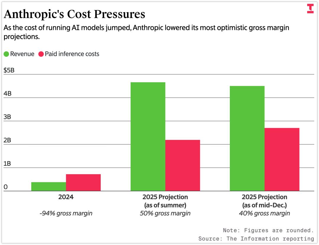 Anthropic面临的成本压力,随着运行AI模型的成本激增,Anthropic下调了其最乐观的毛利率预期,其中绿色代表收入,红色代表模型推理支出,后面两项分别是截止到 2025 夏天和 12 月中旬预期