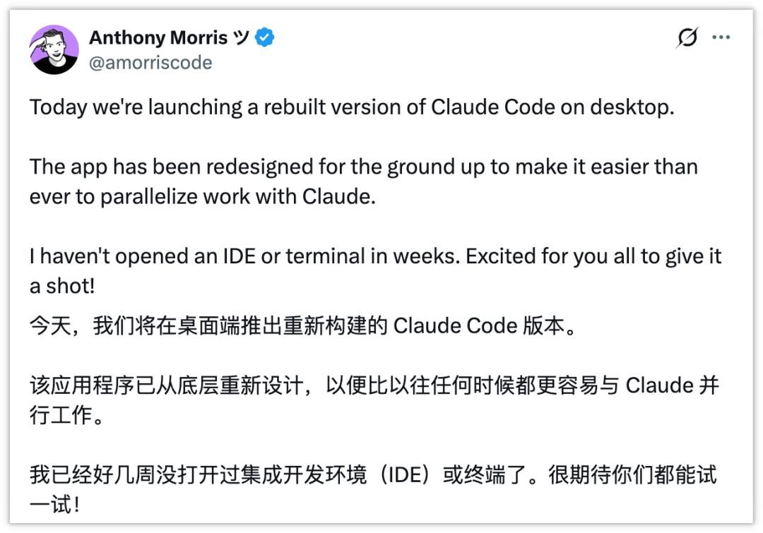 Claude Code 桌面端负责人 Anthony Morris 也发推文说,他自己连续好几周没有用过终端、代码编辑器、集成开发环境这类产品了。