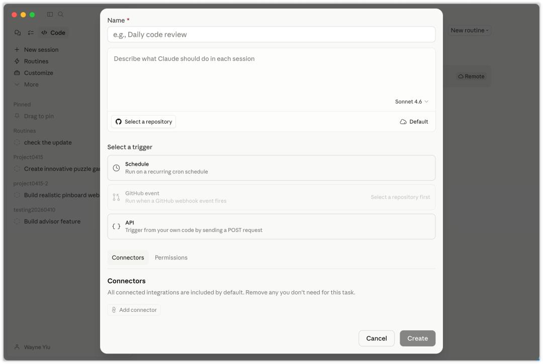 GitHub 事件触发则把 Routine 直接嵌进代码协作流程。Routine 能按照项目配置,自动对代码进行审查,以及决定是否要合并仓库等。