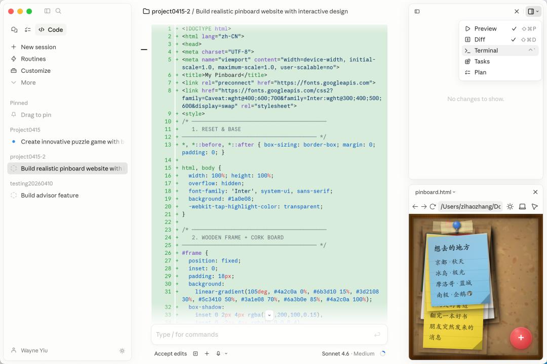 此外,Claude Code 还内置了终端、文件编辑、HTML 和 PDF 预览,原先需要用浏览器打开,或者编辑器处理,这些反复切换的场景,现在在同一个窗口就能完成。