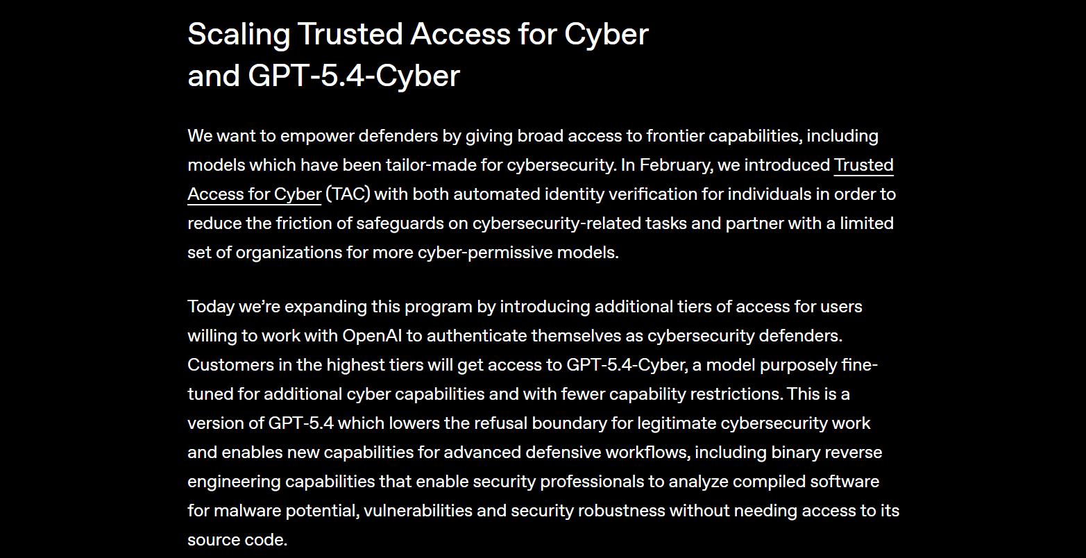按照官方的说法,GPT-5.4-Cyber是GPT-5.4的一个优化版本,该模型拥有更少的功能限制,更强大的网络安全能力,它降低了合法网络安全工作的准入门槛,并为高级防御工作流程提供了新功能