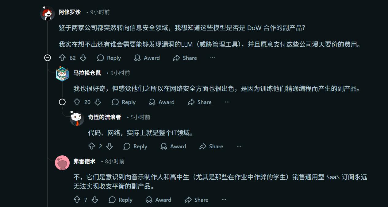 那群巨魔Reddit用户们,属于是一边瑟瑟发抖怕被降维打击,一边调侃说,这批AI大厂终于发现帮高中生写作业赚不到钱,开始对企业安全这块肥肉下嘴了。