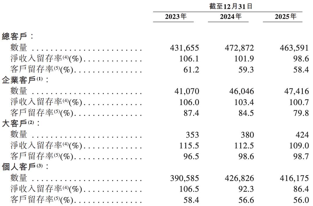 2023年至2025年,公司的整体净收入留存率从106.1%降至98.6%,整体客户留存率从61.2%降至58.4%。企业客户的留存率从87.4%降至79.8%,个人客户的留存率则从58.4%进一步下滑至56.0%。唯有年贡献20万元以上的大客户群体,留存率维持在96.5%至98.7%的高位。