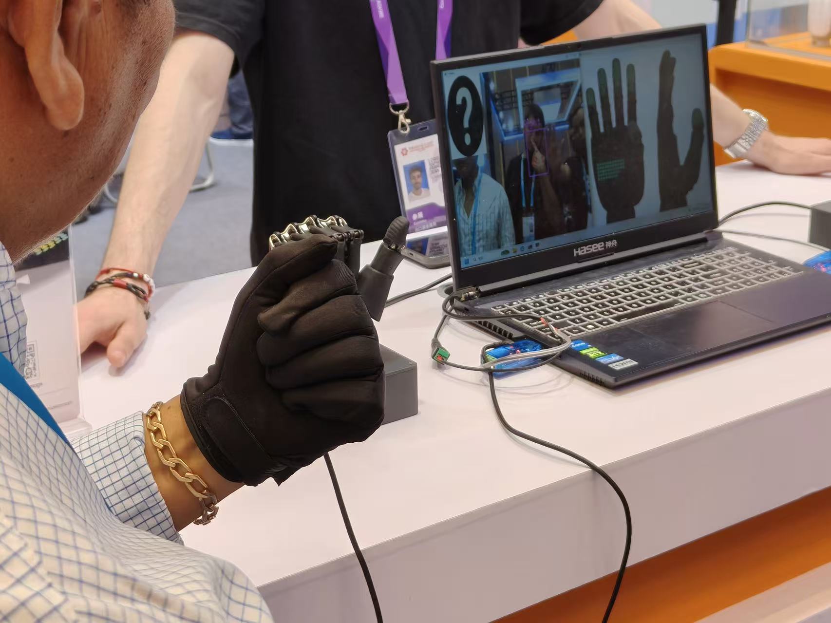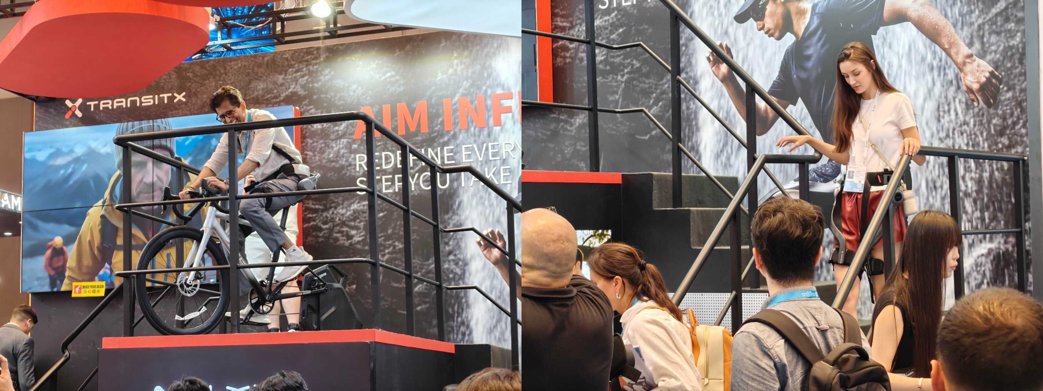 相比于机器人产品展台,雷科技(ID:leitech)发现外骨骼和灵巧手产品展台更容易吸引现场观众排队体验,其中外骨骼更甚。