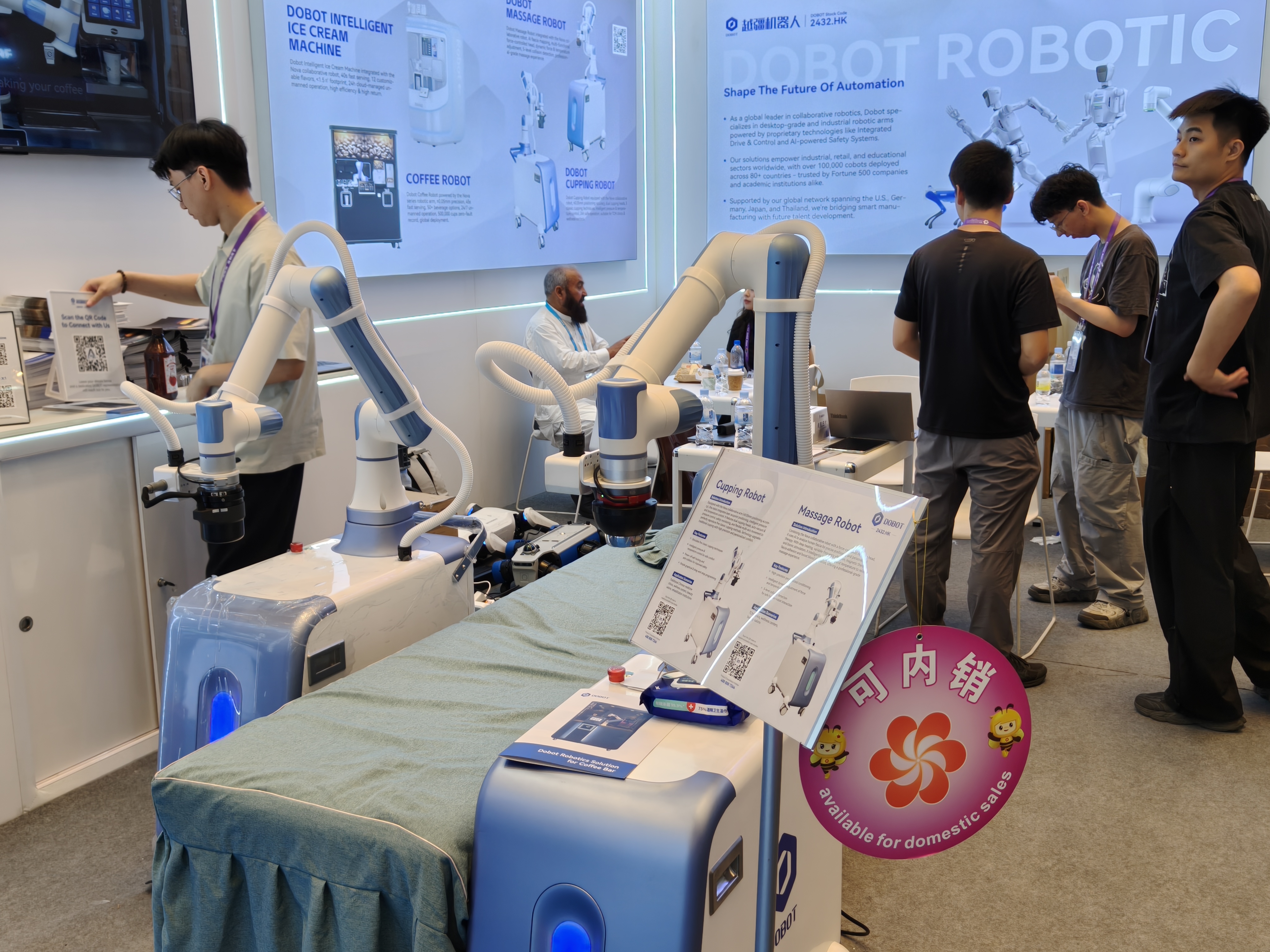 抢先智元,深圳另一家机器人企业越疆已经实现了上市。在广交会展台,雷科技(ID:leitech)报道团看到,越疆同样以机械臂作为目前的主推形态产品,强调其在按摩、制作冰淇淋、吸杯等实际应用场景下的操作娴熟度和流程可靠性。