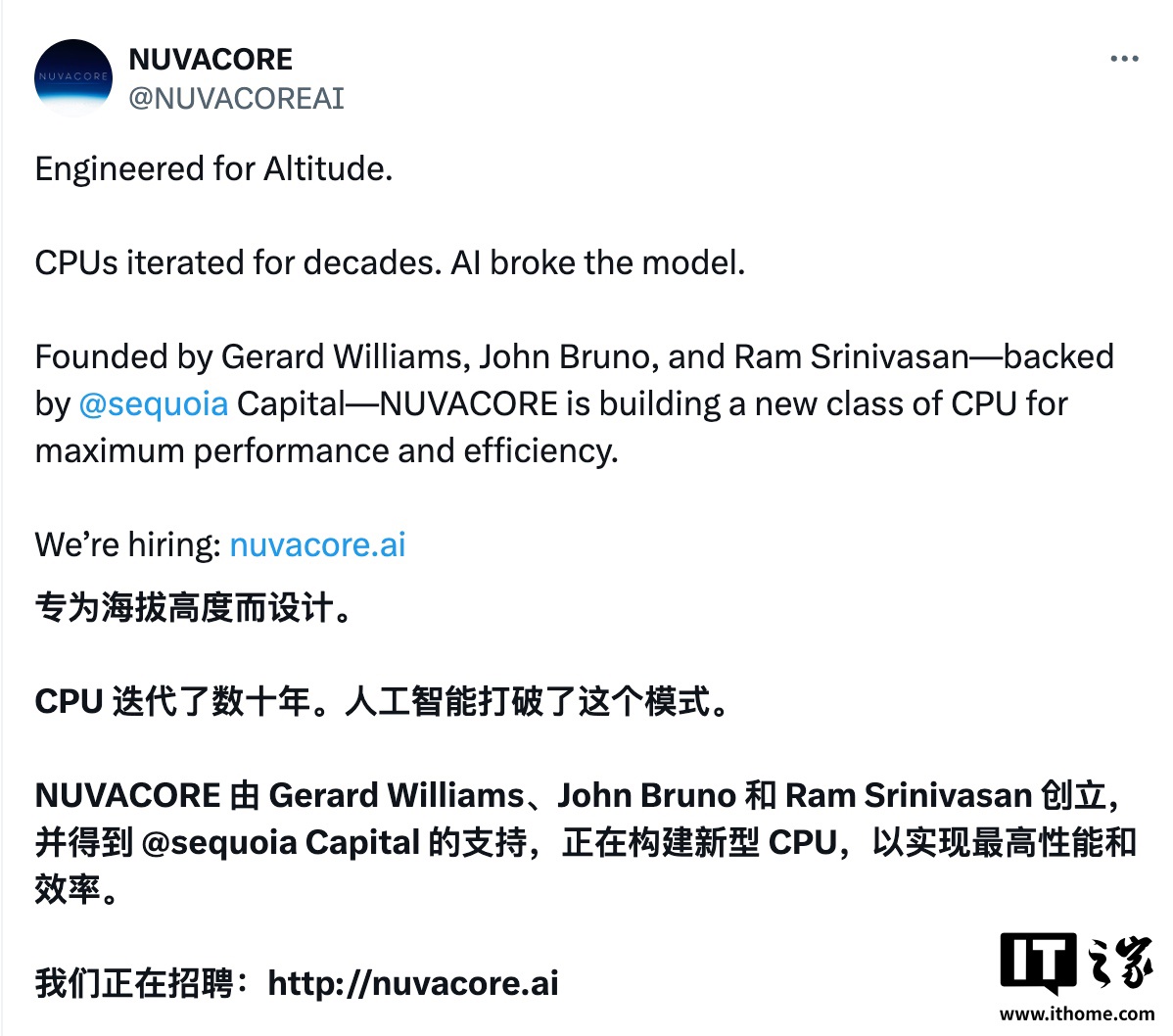 由 Gerard Williams、John Bruno 和 Ram Srinivasan 共同创立,并获得红杉资本(Sequoia Capital)的鼎力支持 ——NUVACORE 正在打造一种全新类别的 CPU,旨在实现极致的性能与能效。