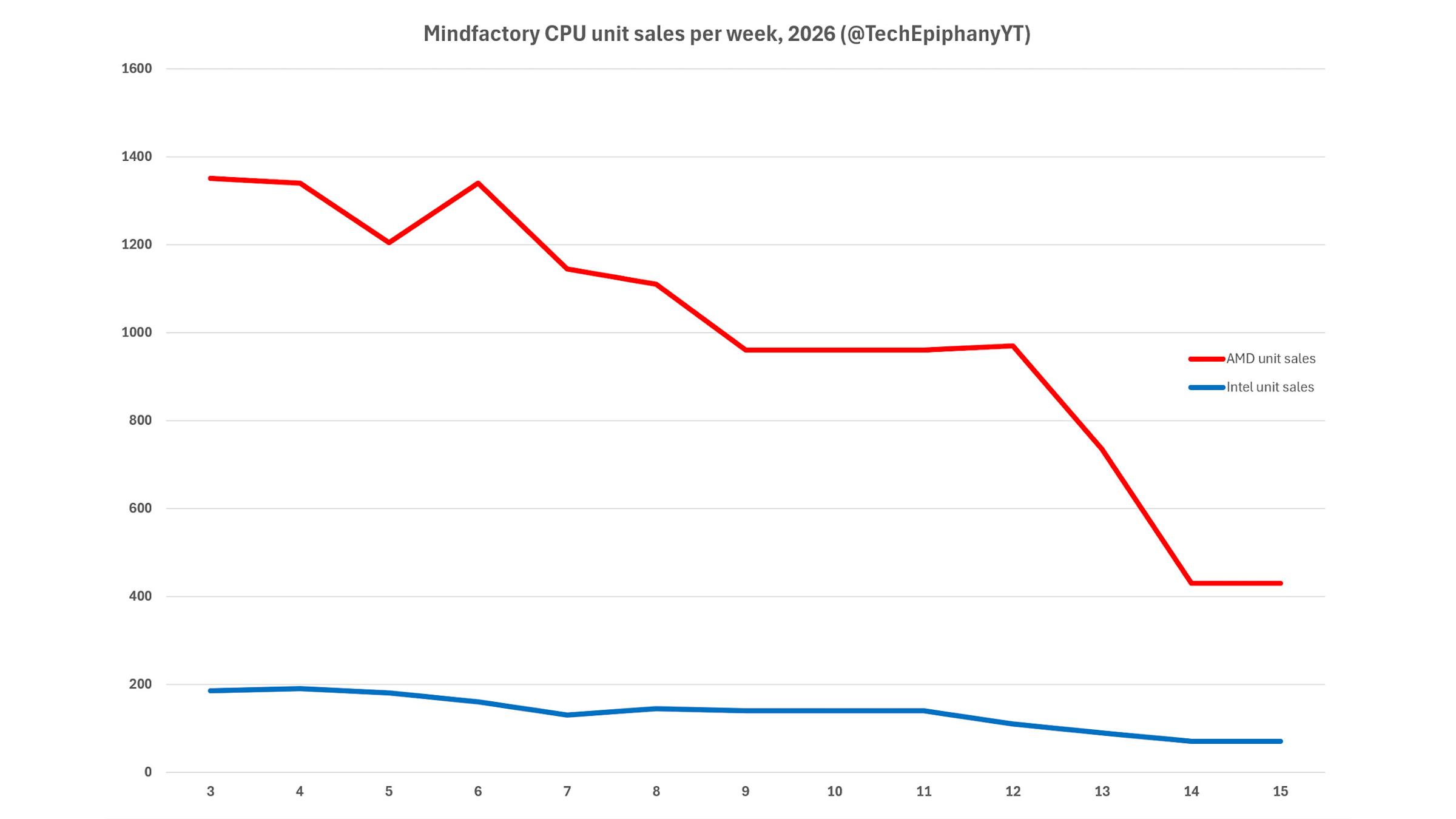 该博主分享的一组销量数据显示了 2026 年第 3 周至第 15 周期间,AMD(红线)与英特尔(蓝线)在 Mindfactory 渠道的单位销量变化。