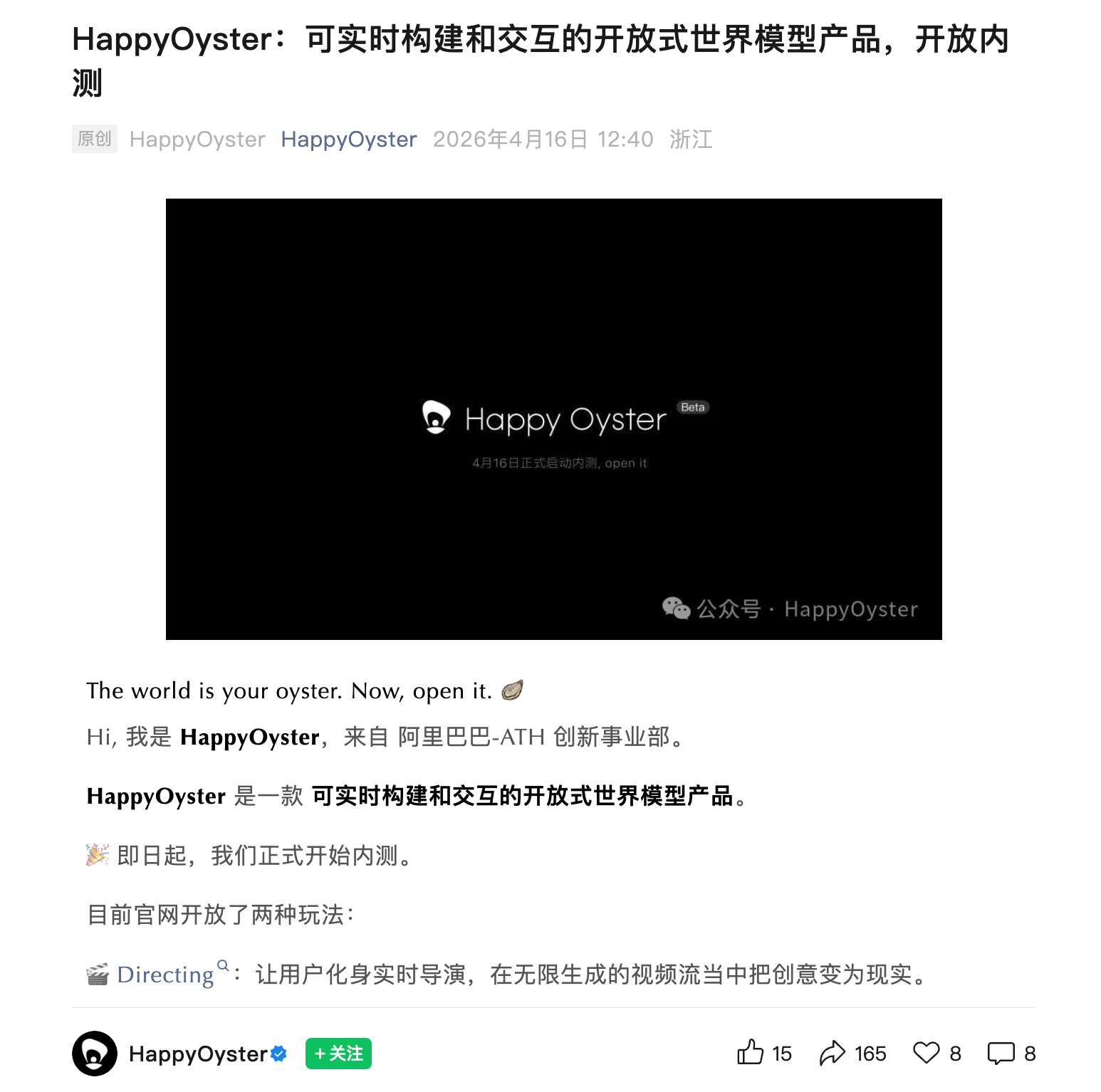 凤凰网科技讯 4月16日,阿里巴巴ATH事业群推出开放式世界模型产品“Happy Oyster”,主打实时世界创建与交互。