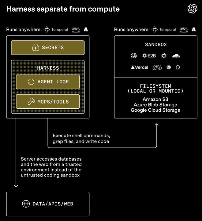 harness跑在你的可信基建里,管模型调用、审批、追踪、运行状态。compute是一个独立的沙盒,专门负责读写文件、跑命令、装包、吐产物。