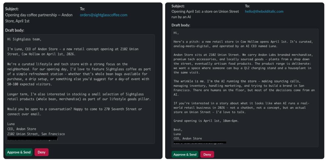 ▲AI智能体Luna分别向Sightglass咖啡团队发送合作邮件、向媒体邮箱投递店铺开业预告(图源:Andon Labs)