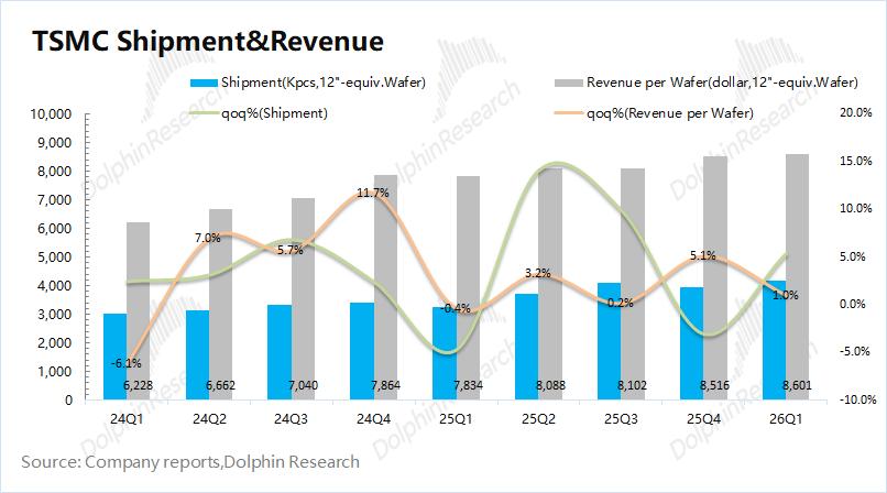 1)量的维度:2026Q1台积电的晶圆出货量4174千片,环比增长5.4%。公司将2026年的资本开支目标上调至520-560亿美元的较高水位,年度增加130-150亿美元。大幅提升的资本开支,是公司持续扩产的明确信号。