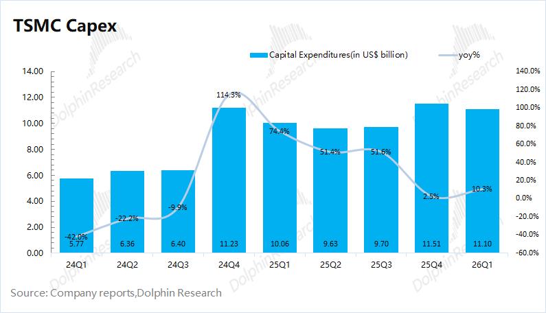 ②资本开支:台积电本季度资本开支111亿美元,由于公司将2026年资本开支计划再度上调至520-560亿美元的较高水位(此前是520-560亿),对应着台积电在随后三个季度的资本开支将有望达到440亿美元左右。