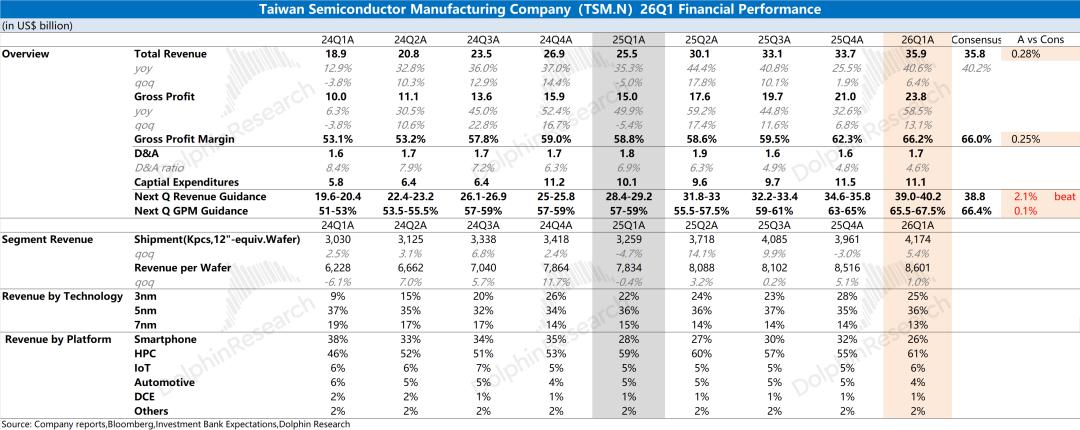 台积电在2026年第一季度实现营收359亿美元, 好于此前指引区间(346-358亿美元)。本季度收入环比增长6.4%,主要受AI芯片需求增长的推动,当前逐步从5nm转移至3nm平台。