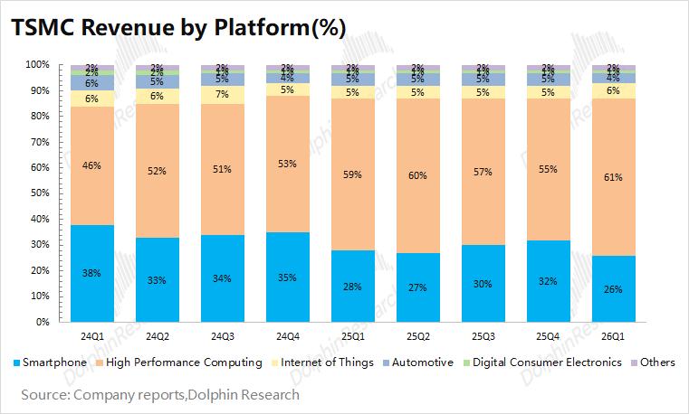 - b.下游应用端:公司本季度收入环增主要来自于AI芯片的需求带动,手机业务本季度出现季节性回落的表现。在英伟达、博通等AI芯片需求的影响下,高性能计算是公司最大的收入来源,本季度达到219亿美元,收入占比达到61%。