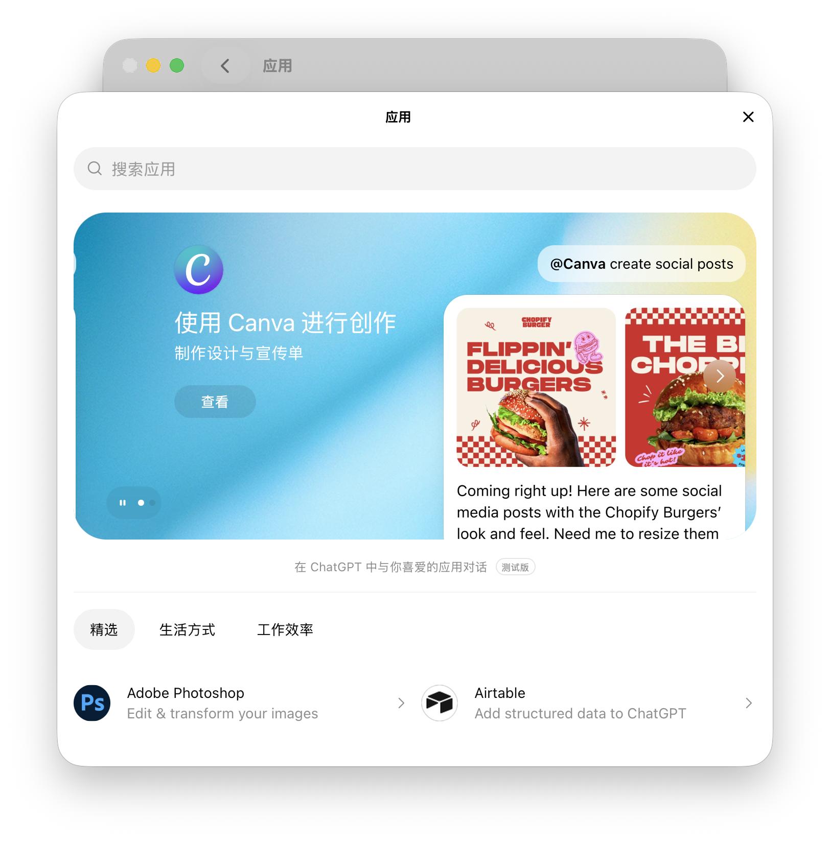 先讲讲 ChatGPT 的桌面端,它已经不只是一个对话窗口,同时也在尝试打造一个以 ChatGPT 为核心的应用生态。在实际使用中,可以直接调用 macOS 本地应用,也可以接入一批已经打通的第三方工具,比如 Adobe Photoshop、Canva、Figma、Apple Music、OpenTable 等。