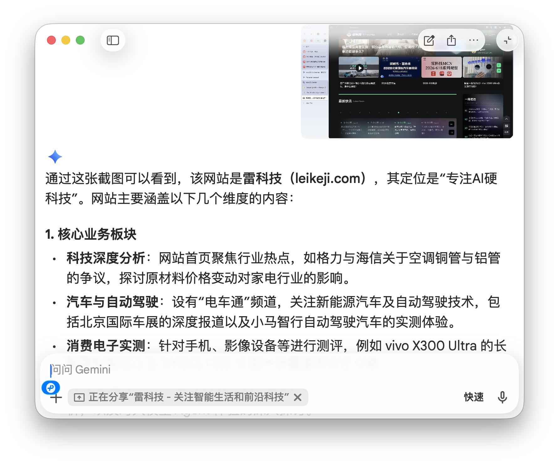 ChatGPT 桌面端的类似功能叫「屏幕截图」,但每次都需要手动触发截图,再发起一次新的请求。而 Gemini 则是一次开启之后,可以在对话过程中持续使用。这在处理文档、表格或者网页内容时,会更顺手一些。