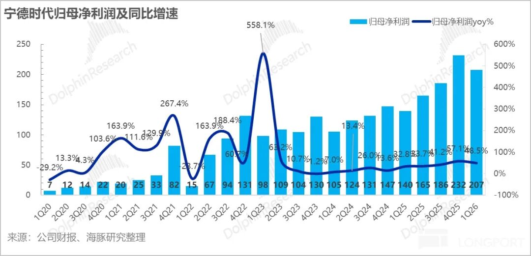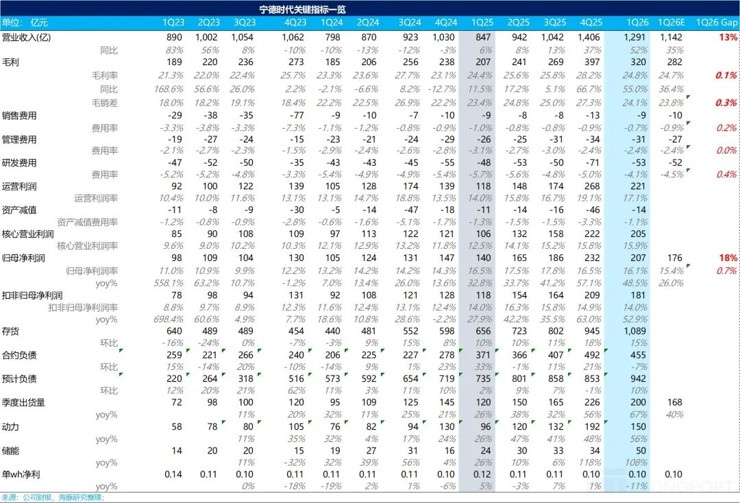 一季度,宁王归母净利207亿(同比增长49%)同样大幅高于市场预期176亿,扣非归母净利润164亿元,同比大增53%。