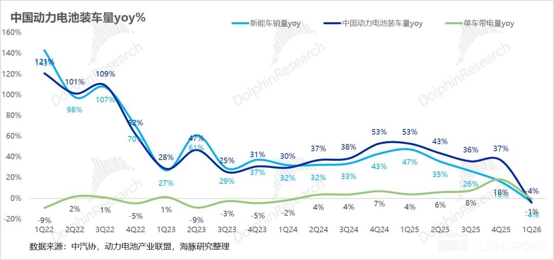 动力电池领跑行业,带电量“杠杆效应”爆发: 动力电池出货约 150GWh(同比+56%),远超国内新能源车销量增速(-4%)。这背后的核心逻辑在于“行业 Beta 升级”:乘用车标配长续航以及高带电量商用车渗透率跃升带来的 1:4 需求杠杆效应已全面兑现。