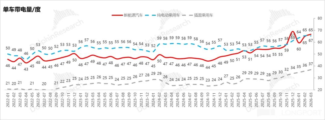 a. 单车带电量继续提升:在纯电与插混车型结构相对稳定的背景下,乘用车电池单车容量仍然在不断上行,据CABIA数据,Q1国内新能源单车平均带电量66.7kwh, 同比增长34%(纯电乘用车65.3kwh, 同比增长21.4%,插混乘用车36.2kwh, 同比增长40.6%)。