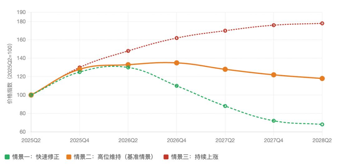 算力价格指数走势:三种情景预测(2025Q2–2028Q2)