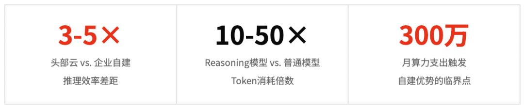 同样跑DeepSeek-R1,头部云厂商的推理效率可以比企业自建高出3到5倍。这意味着同等算力投入下,云厂商能服务更多并发,单位成本更低。